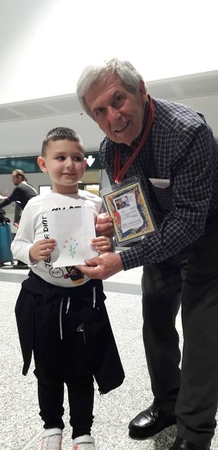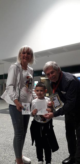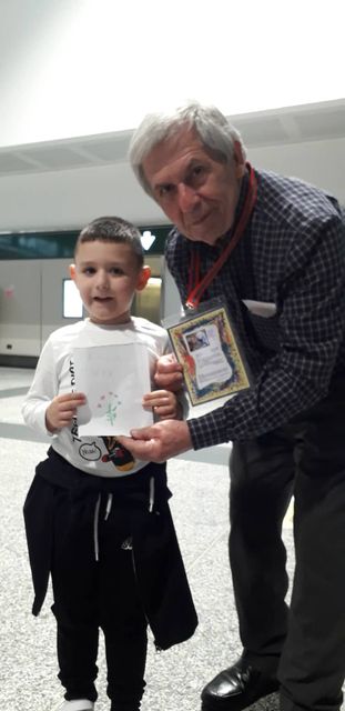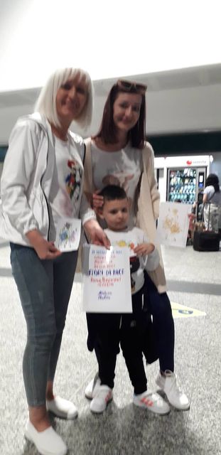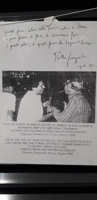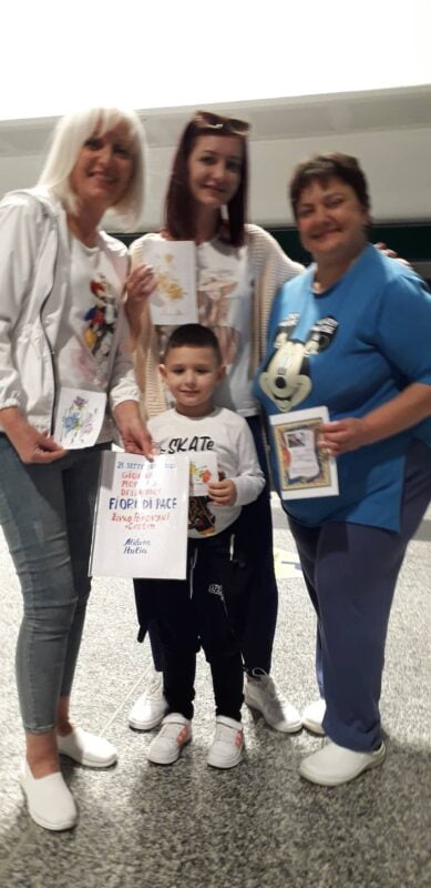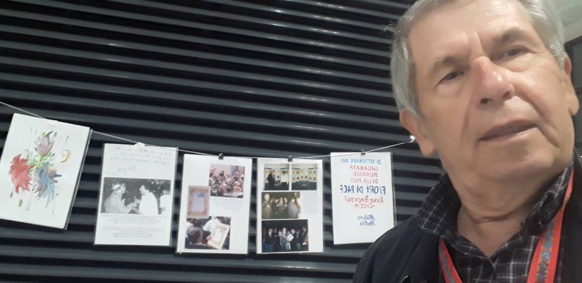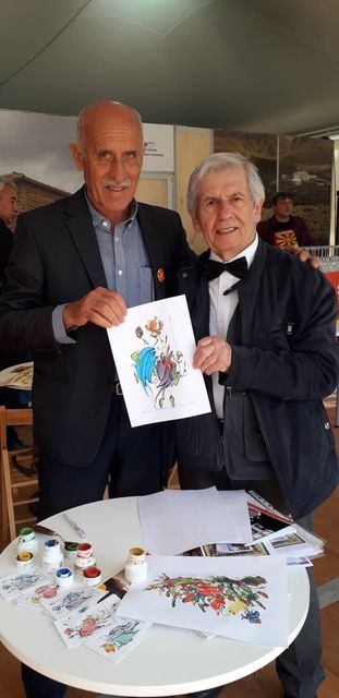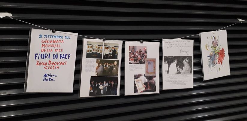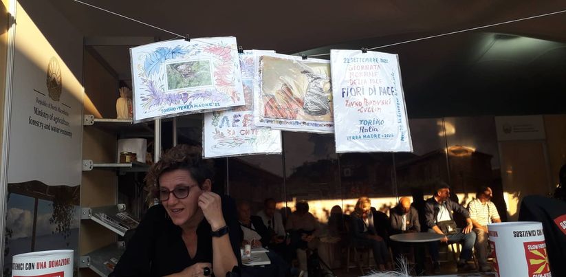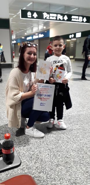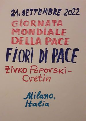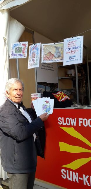-Светскиот ден на Мирот 21 септември, наназад повеќе години го одбележувам со ликовни работилници во воз, заедно со ученици и наставници од Скопје кон Тетово, Гостивар, Кичево, кон Велес, Битола, кон Демир Капија и Гевгелија, кон Куманово и таканатаму, подарувајќи мои слики “Цвеќиња на мирот”. Исто така, овој ден повеќе години го одбележувам во основни училишта и во соработка со Сојузот на борците и невладини здруженија, поети, пријатели, соседи… Годинава, неочекувано, Светскиот ден на Мирот го чествувавме заедно со мојата ќерка Александра во Италија, и за јавноста ќе кажам вака- благодарение на новинарката Валентина Ѓоргиевска Парго која нѐ покани заедно да отпатуваме на Светскиот саем за храна Тера Мадре што се одржуваше во Торино, движење на кое каде таа одамна е дел, и каде патуваше професионално, на големо задоволство. Нѐ покани затоа што јас сум агроном по професија и суштински ја познавам целата таа тематика, а воедно и затоа што сметаше дека мојата мисија треба да добие поширок облик, особено сега во постпандемскиот период кога се раздвиживме. Имено, уште ноќта по слетувањето во Милано започна одбележувањето на Светскиот ден на мирот со подарувањето на мироносни цвеќиња на екипажот (капетанот и неговиот помошник и на стјуардесите). Рано наутро пред тргнување за Торино, на аеродромот Малпенса во Милано, беа поставени мои слики меѓу кои и писмото од Света Мајка Тереза, добиено во 1984 година, каталог од изложбата “Цвеќе, мир, хуманост” одржана во Сан Ремо во септември 1995 година, фотографии со поетот Едуардо Сангвинети, писмото од претседателот Сандро Пертини, а одржав и ликовна работилница при што подарив слики на минувачи од разни меридијани- од Италија, Франција, Нигерија, Еквадор, Либија, Катар, Шпанија, Македонија… Необичен настан со многу убави моменти. На самиот аеродром од четиригодишниот Марко, Македонец, чиј татко е од Либија, и јас добив прекрасна слика изработена од него. Од сам почеток сѐ тргна во интернационална насока. Дури и неколку службени лица дојдоа да нѐ прашаат што е тоа, пред цртежите каде се собираат луѓе цела ноќ, и беа љубезни со нас.