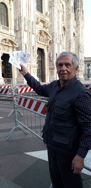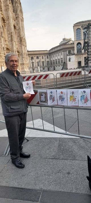 -Најинтересно беше на катедралата ДУОМО каде изложив десет слики и подарив повеќе мироносни цвеќиња на случајни минувачи, а и стекнав нови познанства, како со едни убави луѓе од Риека кои живеат во Италија, една 88 годишна посебно витална госпоѓа, и други луѓе пристигнати од сиот свет за Модната недела во Милано. Тука ја запознавме и брачната двојка од Катар, една посебно шармантна наставничка, која дури ме поканија да изложам кај претседателот на Катар и понуди да ми даде директен број да се јавам и да закажам. Најсреќна беше мојата ќерка Александра која е голем љубител во модата, се одушеви на целиот светски моден ВИП и џетсет свет кој парадираше околу нас, а таа со нејзиниот прекрасен глас потпевнуваше италјански музички нумери а тие се вртеа и аплаудираа. Сите тројца, се одушевувавме од настапот на модната група од светски модели од разни генерации облечени во бело, на отворањето на Модната Недела. Во таа магична атмосфера пред најпознатиот храм на уметноста, катедралата Дуомо немав намера да ги изложам цртежите, сѐ додека, во целата таа пријатна мешаница, не почувствувавме толку пријатна енергија што нѝ го повлече погледот. Се свртивме и забележавме млада преубава девојка со преубав букет големи жолти цвеќиња како се фотографира кај Дуомо, а замислете во сиот тој гламур и екстраваганција погледот на сите беше вперен во цвеќињата. Моќта на цветот си го направи своето. Тогаш, од торбата и јас извадив неколку цртежи, ги поставив пред Дуомо и до бината која ја подготвуваа за почеток на дефилето, и половина час имав своја изложба која ја гледаа присутните минувачи и се фотографираа со неа.