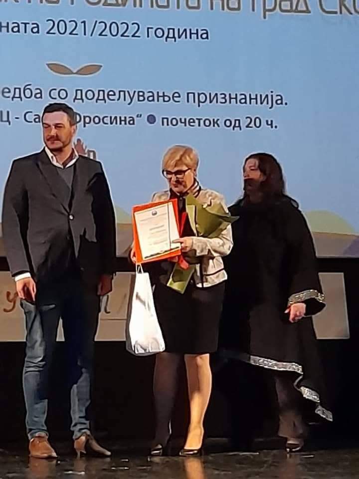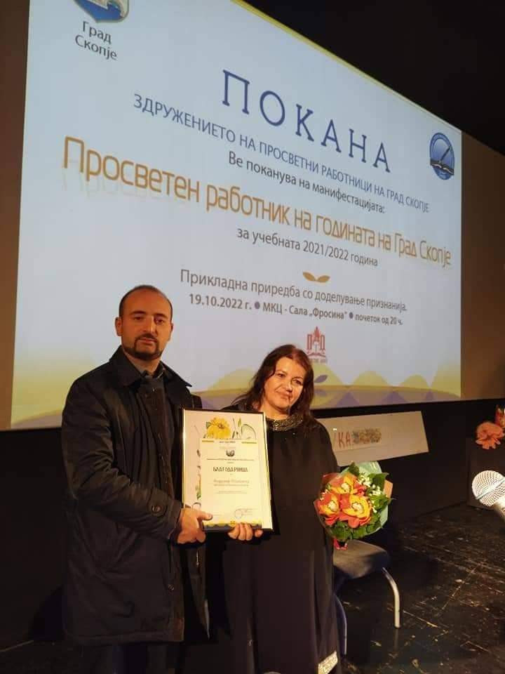 -Преку соодветна програма беа доделени признанија на најдобрите просветни работници на градот Скопје и неговата околина, за учебната 2021/2022 година. На истата манифестација беа наградени просветни работници кои се медиумски познати но и имаше и такви кои не се многу медиумски експонирани а и тоа како се познати во својата фела по многу основи, по професорската врвност во работата, многубројни активности со учениците претставувајќи ја државата како на домашен така и на меѓународен план со освоени многу награди по тој основ, истите се активни и во хуманитарни активности, автори се на многу книги, учебници, уредници на детски списанија и слично.
