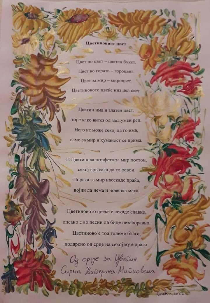 -Токму така, тоа беше настан за паметење кој го организиравме по повод Денот на пролетта, екологијата и поезијата заедно со светски познатиот, а наш ликовен уметник Живко Поповски – Цветин. Тој е миротворец и обединител на луѓето. На настанот со свој настап учествуваа ученици од разни училишта, просветни работници, нашите реномирани поети: Ѓорги Ѓоргиевски – Ѓе. Ѓе., Лилјана Стоилковска, Лидија Јеремиќ Лучко, Мендо Димовски, Илко Димитриевски Шарпланинец и многу други. Свое учество со кое го збогатија настанот имаше и нашата позната оперска певица Серафина Фантаузо и шаховскиот велемајстор познат во светски рамки Димитар Илиевски кој одигра неколку партии шах со присутните.
