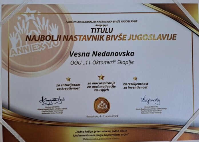 М-Р ВЕСНА НЕДАНОВСКА: Ме прогласија за најдобра наставничка на просторите на поранешна Југославија врз основа на 27 критериуми!
