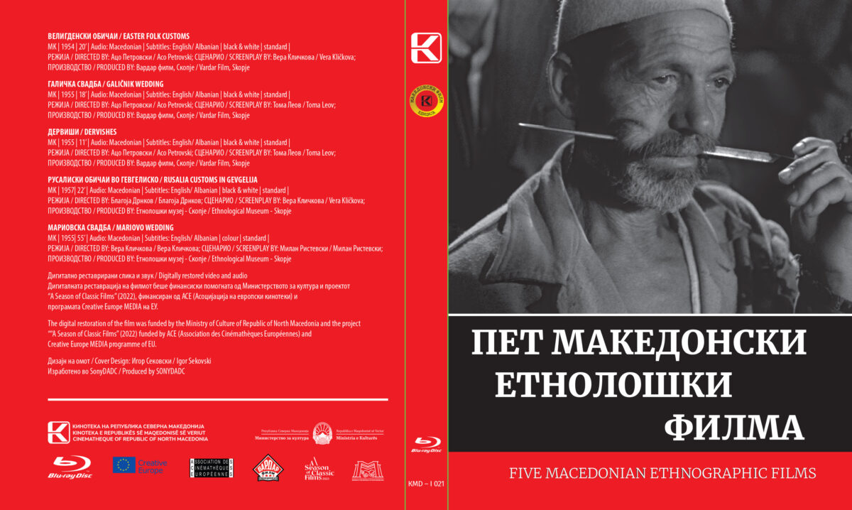 И за второто кинотечно издание кое ќе биде промовирано на 6. декември – блуреј изданието под наслов „Пет македонски ентолошки филма“ може да се каже дека е подеднакво значајно за идентитетот како дел од нашата колективна меморија, но пред сѐ како наше аудиовизуелно културно наследство. Станува збор, како што посочува насловот, за пет документарни филмови со етнолошка тематика, снимени во 1950-ите и 1960-ите години на минатиот век, во продукција на Етнолошкиот музеј – Скопје и продуцентската куќа „Вардар филм“. Документарните филови поместени на овој блуреј – ВЕЛИГДЕНСКИ ОБИЧАИ (1954, р. Ацо Петровски), ГАЛИЧКА СВАДБА (1955, р. Ацо Петровски), ДЕРВИШИ (1955, р. Ацо Петровски), МАРИОВСКА СВАДБА(1966, р. Вера Кличкова) и РУСАЛИСКИ ОБИЧАИ ВО ГЕВГЕЛИСКО (1957, р. Благоја Дрнков) – минатата година беа дигитално реставрирани со средства од меѓународниот проект „Сезона на филмски класици“ на Аосцијацијата на европски кинотеки (ACE- Association des Cinémathèques Européennes), кој пак е финансиски помогнат од програмата МЕДИА на Европската комисија. Дигитална реставрација на петте етнолошки филмови беше извршена од страна на проф. Владимир Павловски, а промотор на блуреј изданието ќе биде етнологот м-р Елизабета Конеска, виш кустос во Музејот на Македонија.