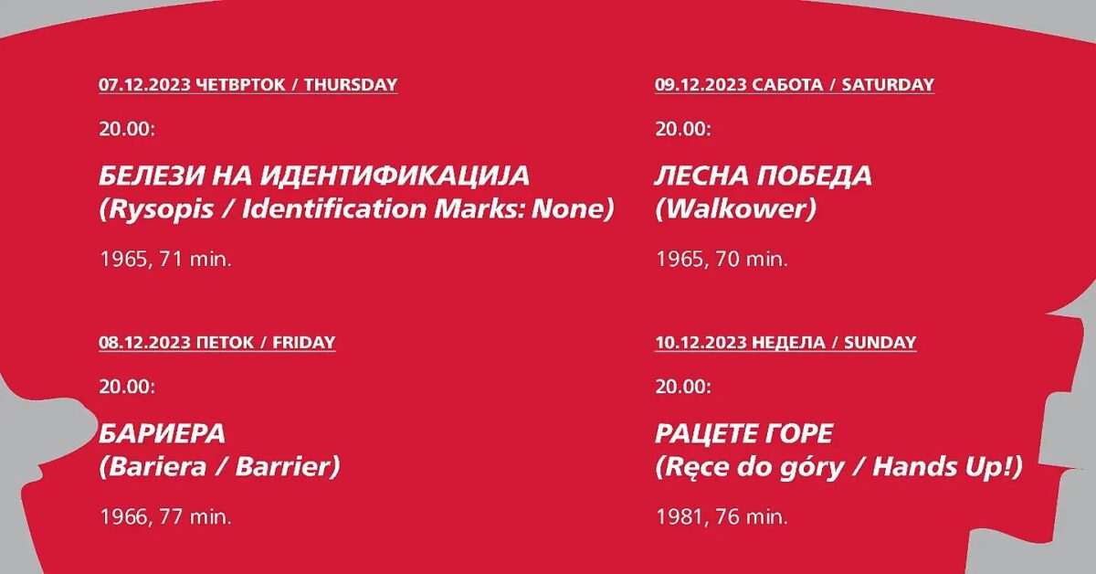 Полскиот режисер Јержи Сколимовски има кариера која трае повеќе од 60 години, чии филмови од шеесетите години на минатиот век се сметаат за најава на новите естетски тенденции во полската кинематографија. Токму во тоа ќе можат да се уверат филмофилите гледајќи ги неговите филмови во првата половина на месецов. Она што е за одбележување е проекцијата на можеби најценетиот филм на Сколимовски РАЦЕТЕ ГОРЕ, за товарот на сталинистичкото минато на Полска, забранет за прикажување во земјата цели 18 години. Би го споменале и неговиот последен филм, ИО, еден од неговите најоригинални и визуелно најинвентивни филмови со кој Сколимовски покажува дека има уште што да каже.