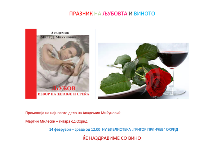 По тој повод во Библиотеката музички перформанс на гитара ќе изведе познатиот охридски и македонски гитарист Мартин Милески а ќе биде промовирана и 121 книга од Академик д-р Миле Миќуновиќ со наслов: „Љубов – извор на здравје и среќа“.