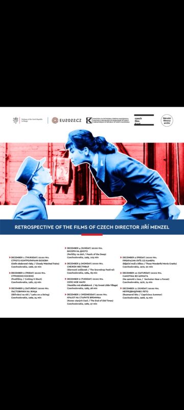 Од 1 декември (четврток) до 11 декември (недела) – Кинотеката, во соработка со Амбасадата на Чешката Република – организира голема ретроспектива на легендарниот чешки режисер и глумец Јиржи Менцл (Jiří Menzel). Оваа ретроспектива ќе биде отворена со филмот СТРОГО КОНТРОЛИРАНИ ВОЗОВИ (Ostře sledované vlaky / Closely Observed Trains), дебитантски долгометражен игран филм на Менцл (1938-2020), со кој освои „Оскар“ за најдобар странски филм во 1967 година.