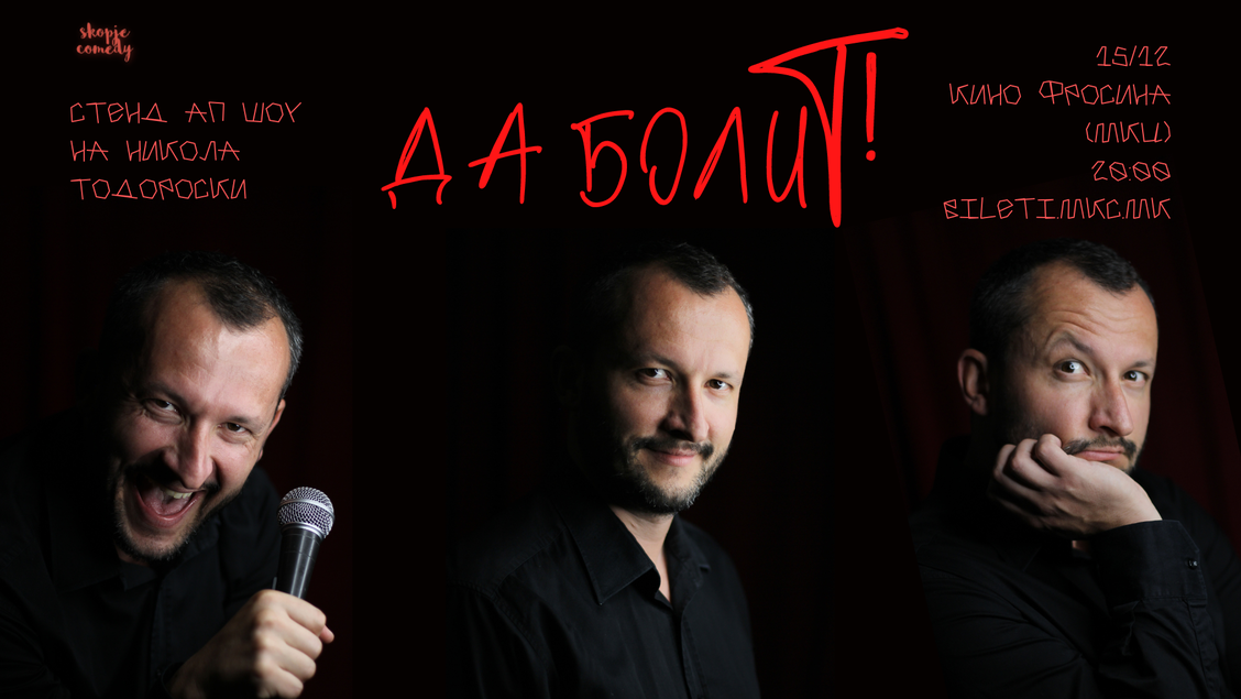 На 15-ти декември во Кино Фросина во Младинскиот Културен Центар во 20 часот, ќе настапи Никола Тодороски со своето најново стенд-ап шоу со наслов „Да болиТ!”. Настанот го организира Skopje Comedy и ги охрабруваат сите скопјани да дојдат на шоуто ако сакаат на пролет или лето охриѓани да ги пуштат на плажа.