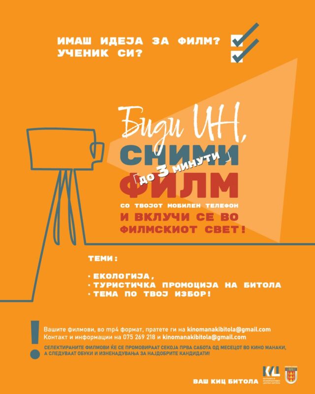 ЈОУ Културен и информативен центар Битола, со нова креативна иницијатива ги анимира младите битолчани од основните и средни училишта, преку создавање на кратки филмови да ја искажат својата креатива идеја. Пред идните сниматели, режисери и сценаристи или актери поставен е предизвик да снимат краток филм со времетраење до 3 минути, користејќи се со мобилен телефон, на темите: Туристичка промоција на Битола, Екологија и секако слободна тема.