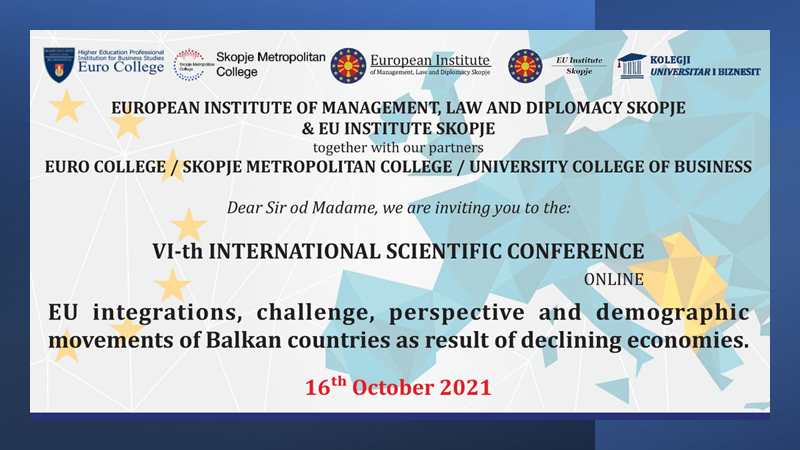 Европскиот институт за менаџмент, право и дипломатија Скопје и ЕУ Институт Скопје организира 6-та меѓународна научна конференција (он-лајн) насловена како „ЕУ интеграции, предизвик, перспектива и демографски движењата на балканските земји како резултат на економиите во пад“ во соработка со: Еуро Колеџ Куманово, Метрополитен Колеџ Скопје и Универзитет Kолеџ за Бизнис.