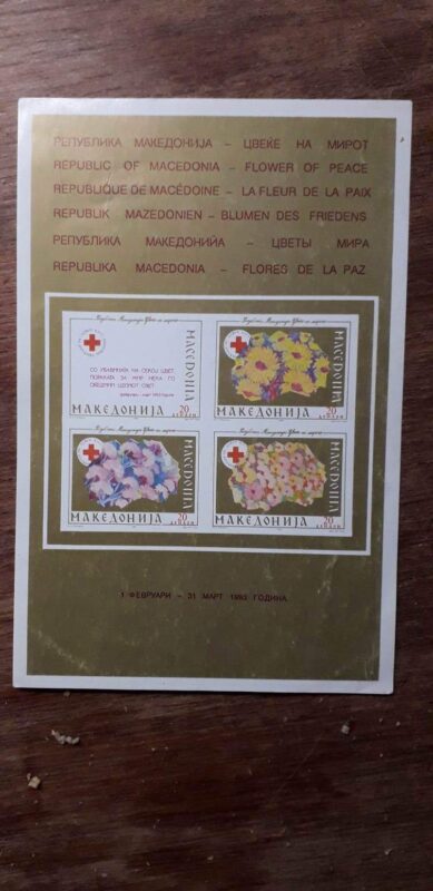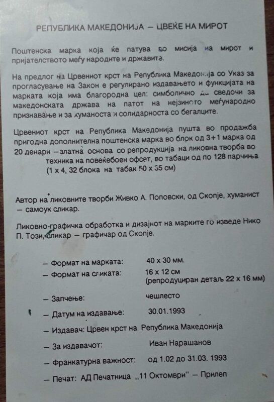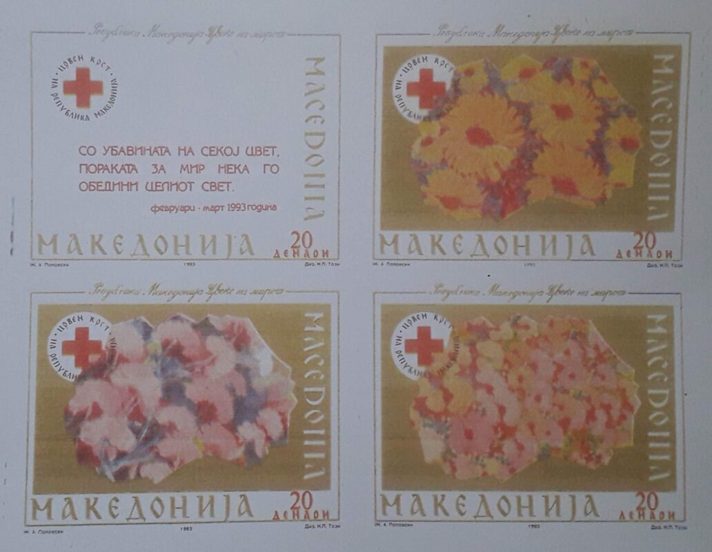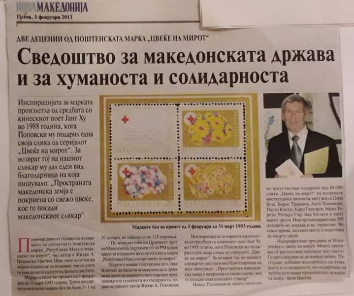 -Тоа навистина ме поттикна и Македонија да ја сликам со цвеќиња и во 1993 година да излезе една поштенска марка “Република Македонија цвеќе на мирот” која беше одобрена од страна на пратениците на Република Македонија, а тоа го направивме на моја иницијатива и со голема поддршка и помош од мојот почитуван Стојан Тренчевски. А тоа преку Црвениот крст таа иницијатива ја реализирате да преку Собранието на Македонија да се донесе односно да се промовира една марка “Република Македонија- Цвеќе на мирот”. Јас три апликации дадов со Македонија и сите три марки се од 1993 година беа во оптек од 1 февруари до 31 март и таму се изработија комплет за овие филателисти и картички и блокови и навистина тоа беше една промоција на Македонија како цвеќе на мирот низ светот. Пораката на марката беше со убавината на секој цвет пораката за мир нека го обедини целиот свет, Република Македонија- цвеќе на мирот, се посетува Цветин.
