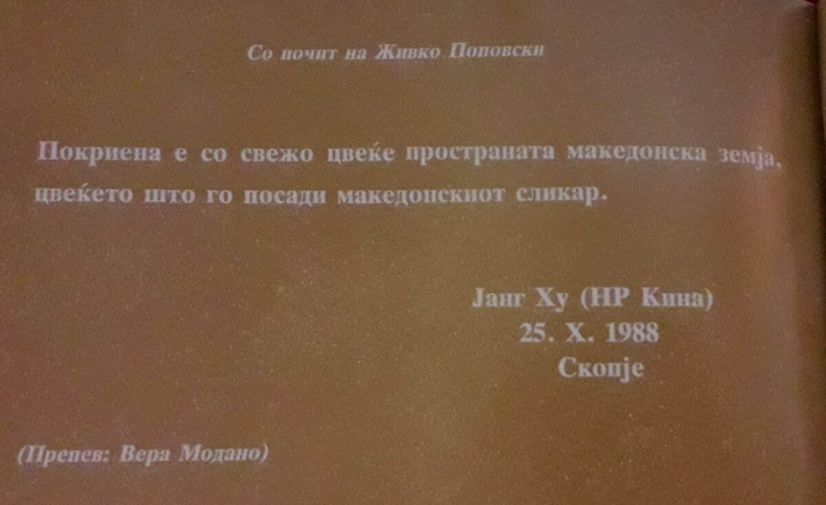 Во контекст на марката авторот ги посочива стиховите што му ги подарил кинескиот поет и учесник на Струшки вечери на поезијата, кој запишал: “На Живко Поповски- Покриена е со свежо цвеќе, пространата македонска земја, цвеќето што го посади македонскиот сликар. Јанг Ху Народна Република Кина” .
