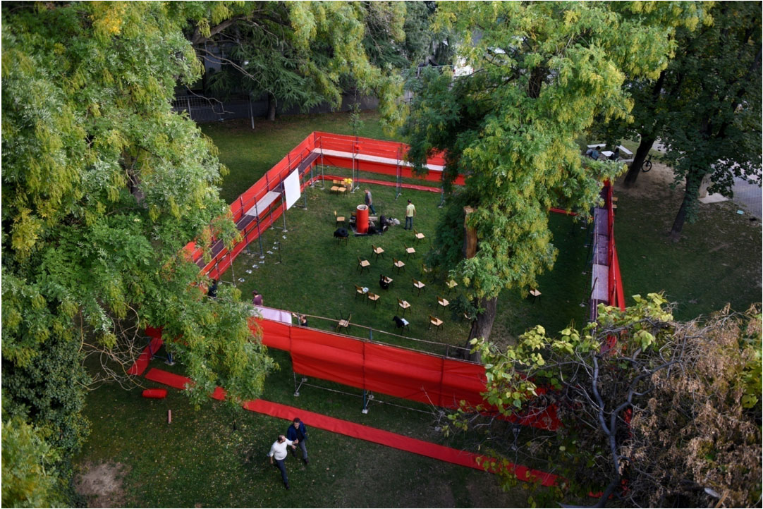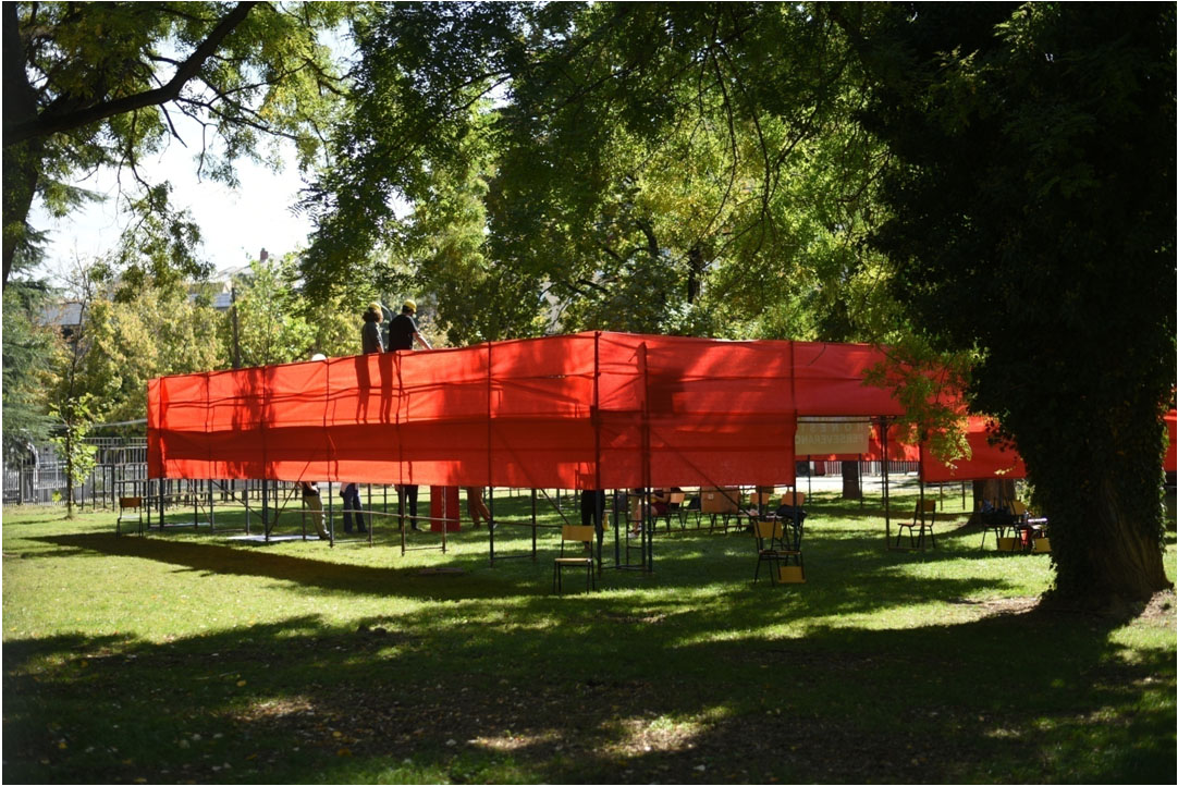 Дијалектичкиот ѕид во овој случај е машина која генерира дејства преку воспоставување динамичен однос на генеричкиот (апстрактниот) наспроти активниот простор (место) во градот, поставувајќи го прашањето за односот помеѓу публиката и изведувачите. Ѕидот е самата сцена, простор кој дијалектички ја вклучува публиката во дејството, го реактивира градот во создавањето на дејствата (настаните) и со тоа го трансформира во перформативен град/сцена.