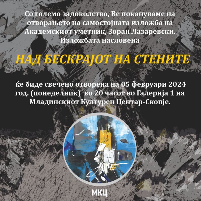На 5 (понеделник) февруари, 2024 година во Галерија 1 при Младинскиот културен центар, а со почеток во 20 часот, ќе се реализира изложба на цртежи на академскиот уметник, Зоран Лазаревски.