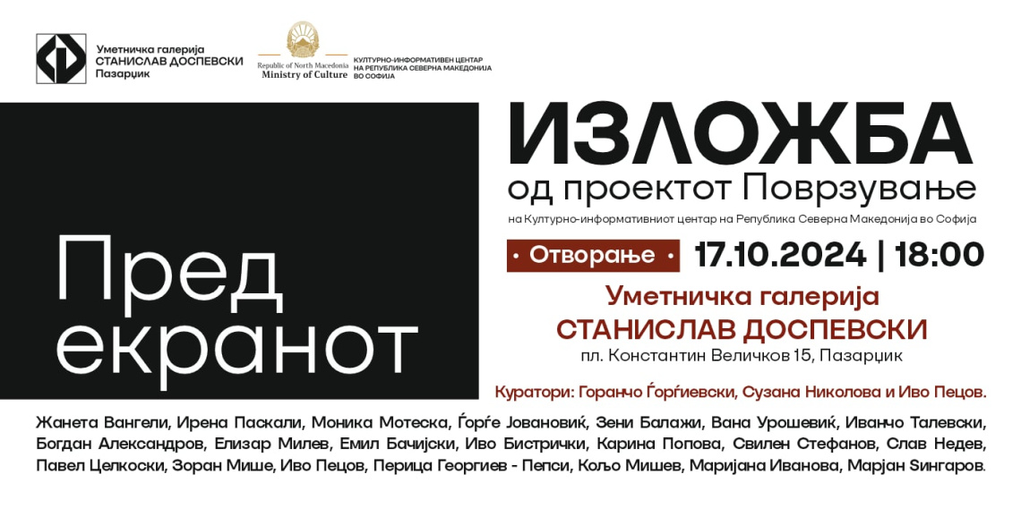 Во Уметничката галерија „Станислав Доспевски“ во Пазарџик, на 17 октомври (четврток) 2024 година, со почеток од 18:00 часот, ќе се одржи отворањето на ликовната изложба „Пред екранот“, составена од дела на 21 автори од Северна Македонија и Бугарија.