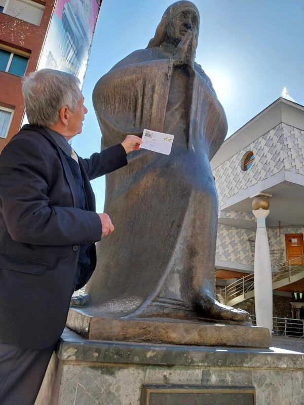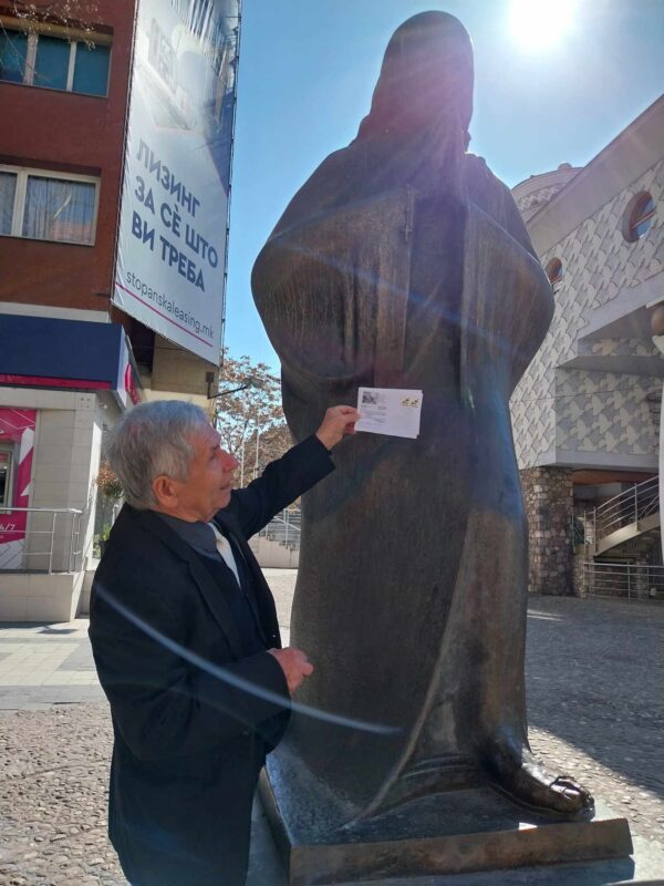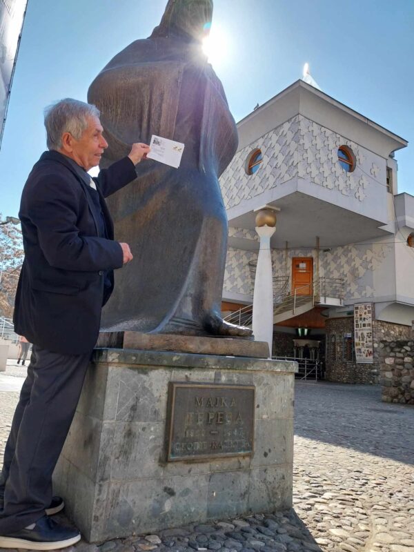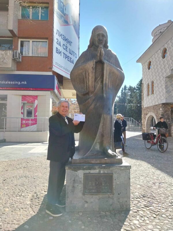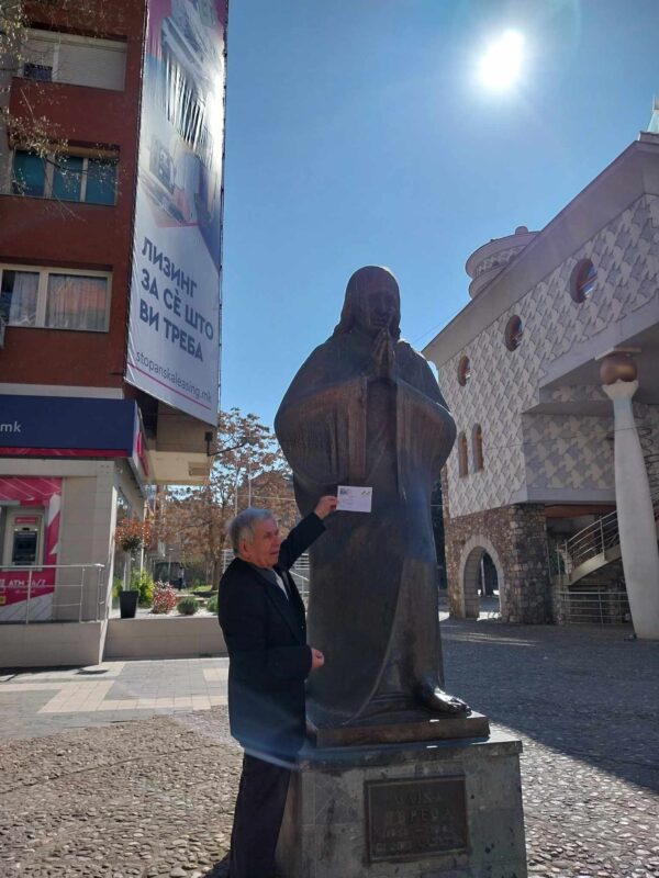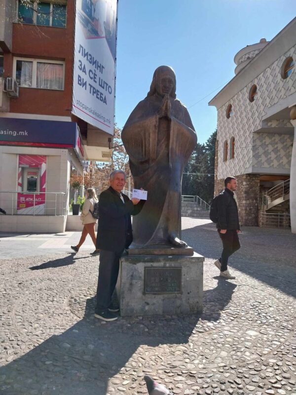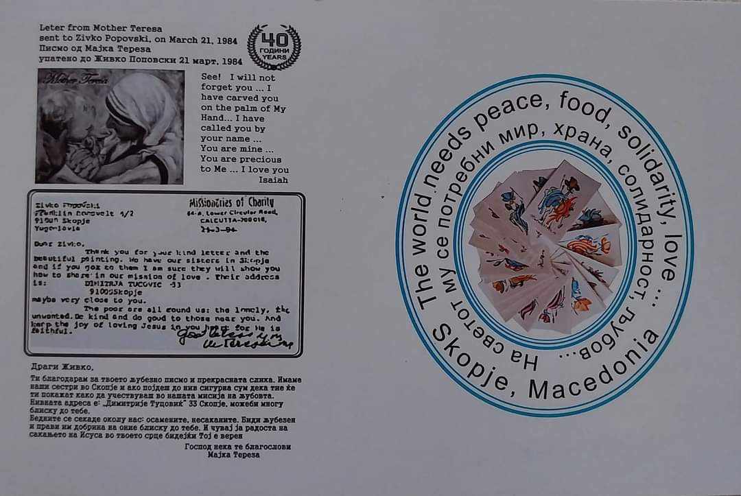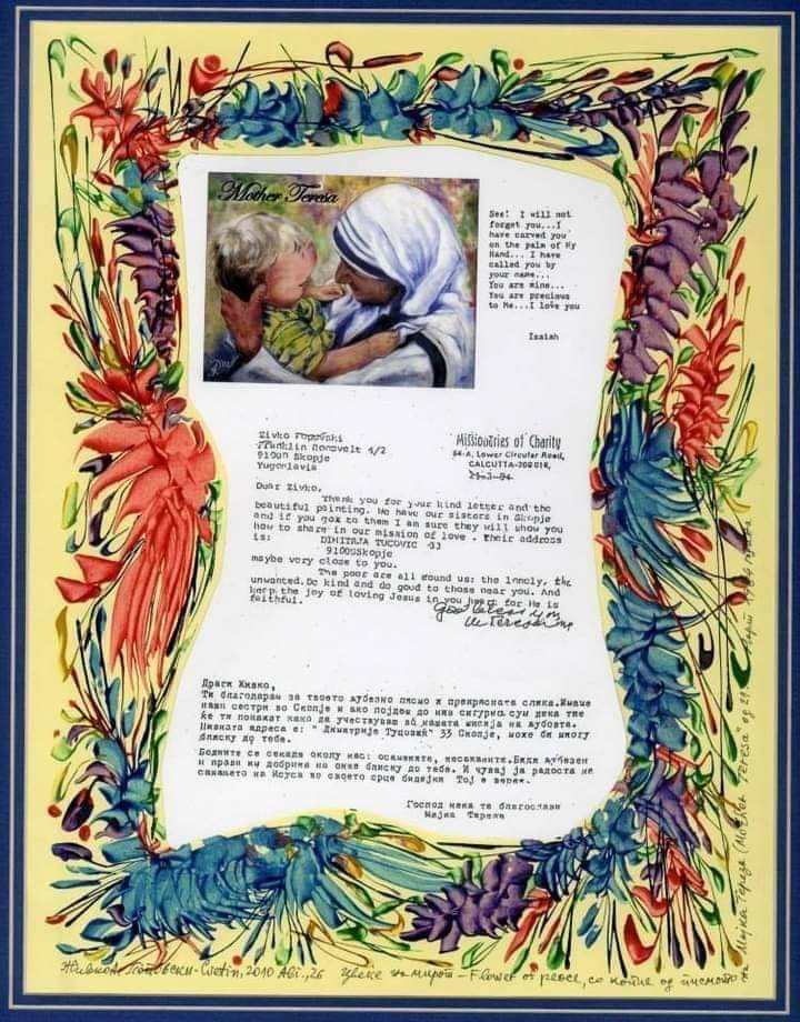 – На тој пат подарив 99 копии од писмото од Мајка Тереза во цветни венци на Домови за деца без родители, на домови за стари лица, на католички цркви, на амбасади од Македонија во Косово, Белград, Загреб, Љубљана, конзулат во Венеција, на наша амбасада во Ватикан. Подарени се 99 такви писма со цветен орнамент слики (35 х 50 см), со писмо од Мајка Тереза за 99 година од раѓањето на Мајка Тереза.Така што 99-то писмо беше дадено на папата Бенедик 16 на мисата во Ватикан пред црквата СВ.Петар и Павле. Сето тоа беше во организација на Здружението Скопјанката Мајка Тереза чии претседател беше Стојан Тренчевски. Во Конзулатот во Венеција оставив 10 мои слики (од кои една со писмото на М.Тереза) кои беа изложени на Венецијански биенале 2009 година.