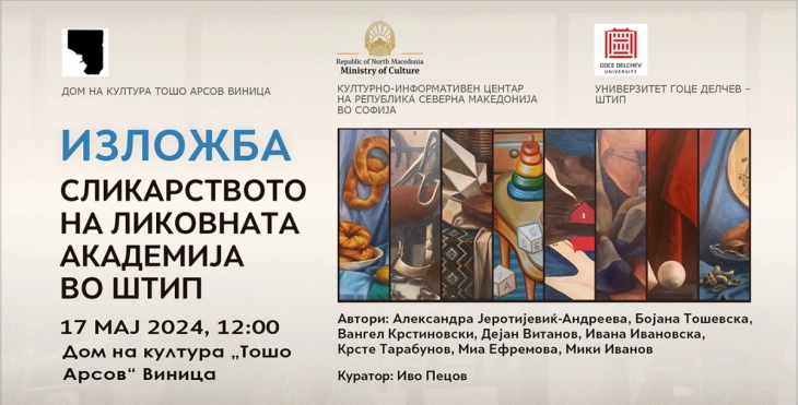 Во галеријата на Домот на културата „Тошо Арсов“ во Виница на 17 мај (петок) 2024, со почеток од 12:00 часот, ќе биде отворена ликовната изложба „Сликарството на Ликовната академија во Штип“.