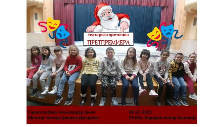Денеска (28 декември, 2022 година), во Народниот театар- Гевгелија, со почеток во 19 часот, најмалата возрасна група од Детското драмско студио при ЈОУ Дом на култура „Македонија“- Гевгелија премиерно ќе ја изведe претставата „Претпремиера“. -Претставата е спој од една Дедомразовска едночинка, стихотворби од „Зајче без опавче“, детски забавни едночинки и познати песнички, во која малите актери ќе ве поведат на незаборавно патување низ детските среќни денови, вели Катиџа Џишева Дупарова, режисер на претставата и раководител на Детското драмско студио, која со нетрпение очекува нејзините ученици да го презентираат сработеното во пресрет на Новата година. Влезот е слободен.