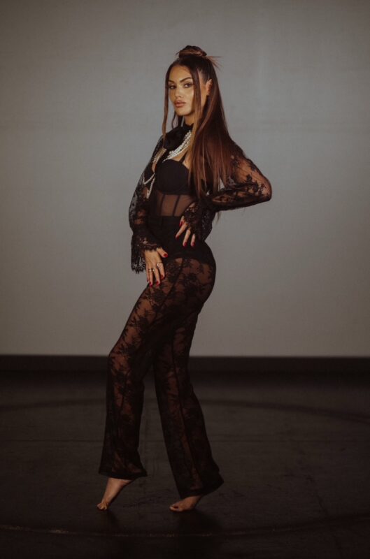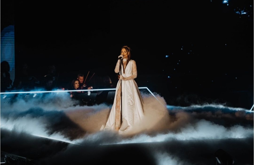 Но на сцената, таа блесна во бел фустан со длабок шлиц и кристали во креација на ЈЗЈ- Златко Јовановски, кој симболизира светлина, чистота, надеж, целосно помирување и внатрешна хармонија. Додека пак за фризурата и шминката се погрижи Даниел Николовски.