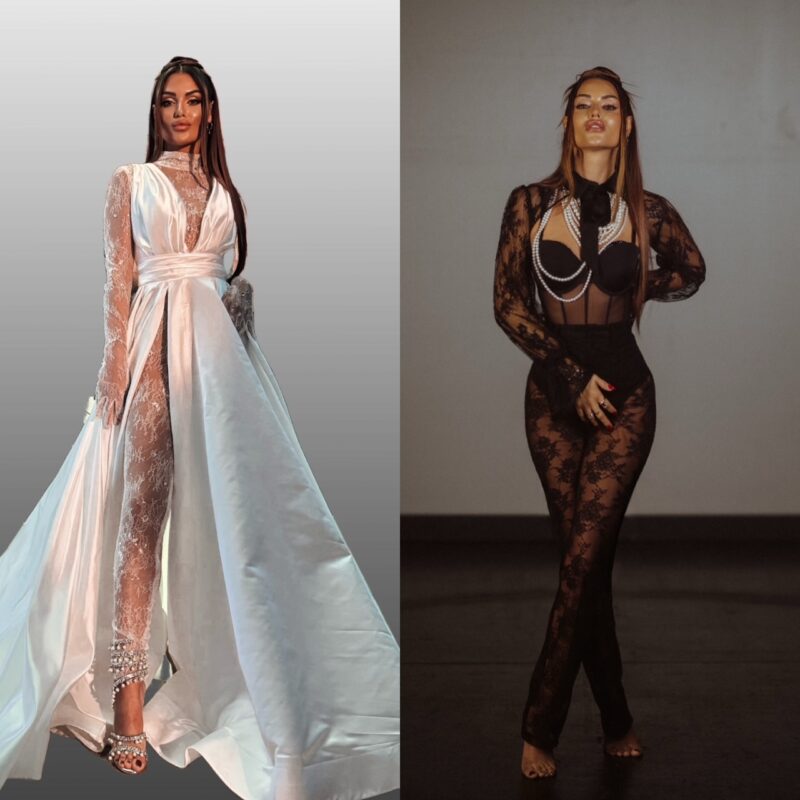 Но на сцената, таа блесна во бел фустан со длабок шлиц и кристали во креација на ЈЗЈ- Златко Јовановски, кој симболизира светлина, чистота, надеж, целосно помирување и внатрешна хармонија. Додека пак за фризурата и шминката се погрижи Даниел Николовски.