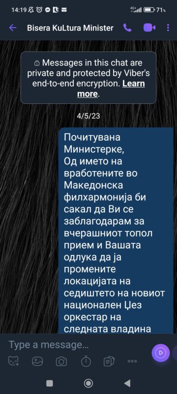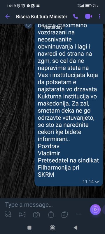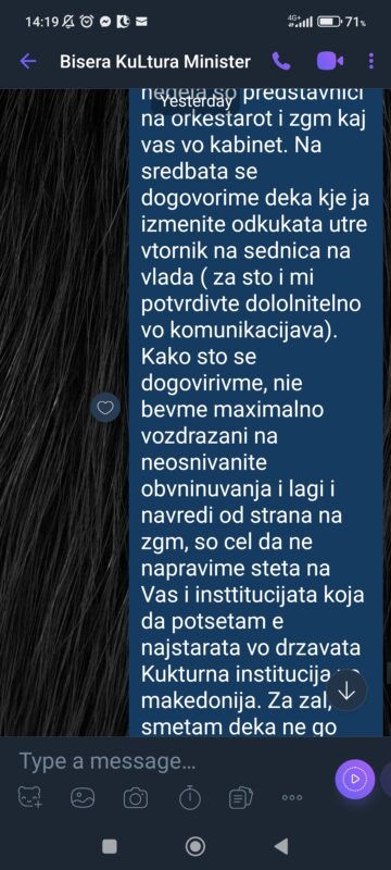 Договори, преговори, состаноци, биле тајна. Со нас, со колективот, со уметниците музичари, со раководителот и Управниот одбор ниту збор. Ниту информација, ниту прашање, ниту разговор, ниту бутур. Да. Зградата е на државата и Филхармонијата исто. Ама не и музичарите, уметниците, ансамблот.