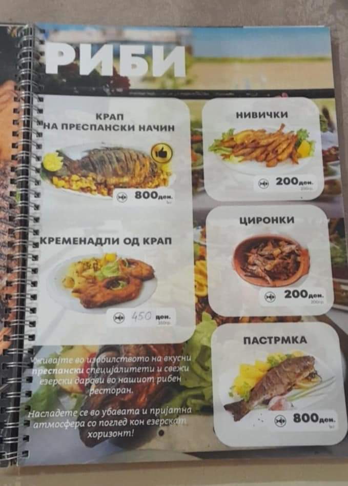 -Од риба, најпознати сме по крапот на преспански начин, мајсторски испечен во рерна, со фил од пиперка и домат, а веднаш по него доаѓаат пржените кременадли на скара. Цената на крап од кило е 800 денари, што не е скапо, а по кременадлите се подразбира и порачка од чинија со белвици или познати како нивички е она по што сме најпрепознатливи, по 200 денари од порција. Циронките пак се исклучиво преспански специјалитет што го нема никаде на друго место и најмногу се јадат во зима, тоа се всушност на таван сушени белвици, нивички или плашливи, како сакате, нанижани во низа од коноп, а потоа така суви подготвени во вода со масло, со малку киселина и лукче. Овие специјалитети најмногу се бараат од странците. Тие можат да платат и многу повеќе, а ние како за специјалитет може да ги кренеме цените многу високо, но мора да сме прилагодливи и кон нашите гости, и тие да бидат испочитувани. За странците не е проблем цената, но првенствено мора да се задоволни нашите, ја открива тајната на својот успех младиот угостител.