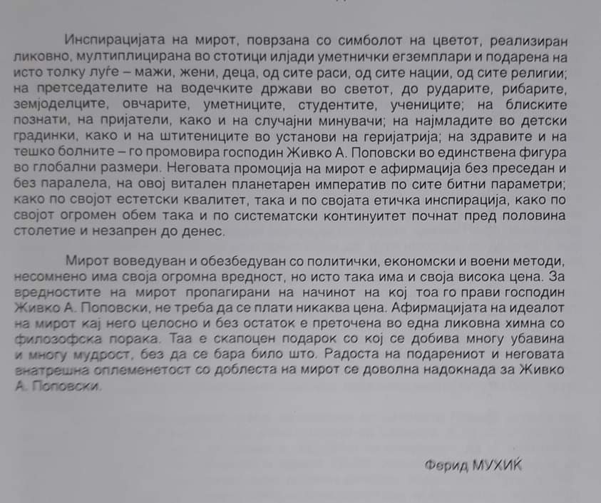 Неуморниот сликар и хуманист Живко Поповски – Цветин вчера, 18 Ноември, му додели ” Цветинова награда за мир“ и на истакнатиот македонски универзитетски професор, филозоф и публицист, Ферид Мухиќ. Цветин нагласи дека доделувањето на „Цветиновата награда за мир“е по повод Светскиот ден на филозофијата. Овој ден, кој е востановен од УНЕСКО, секоја година се одбележува третиот четврток од ноември и се слави низ целиот свет, со фокус на филозофијата и нејзините придобивки, а тоа на некој начин е поврзано со културата, науката и мирот – изјави Живко Поповски – Цветин.