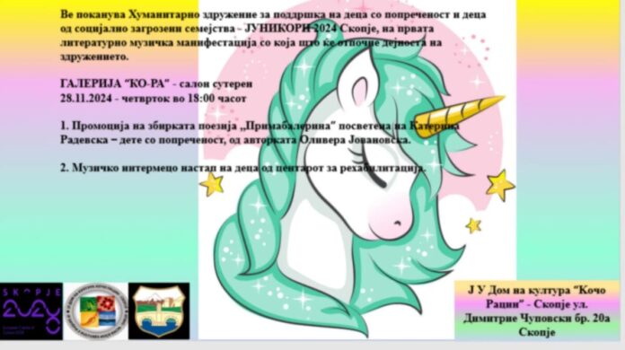 Во април оваа година се основа хуманитарното здружение за поддршка на деца со пречки во психо природниот развој и деца од социјално загрозени семејства- “Јуникорн”.