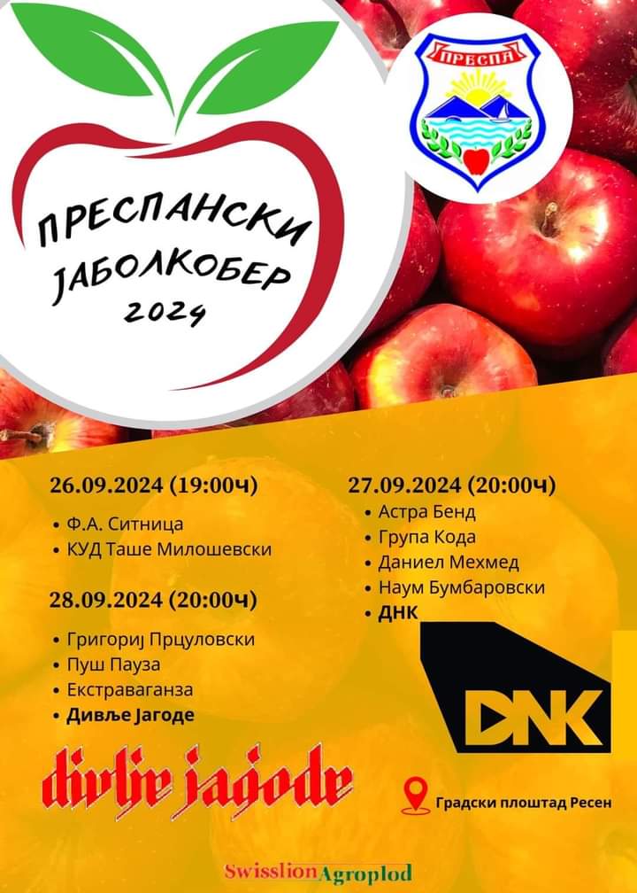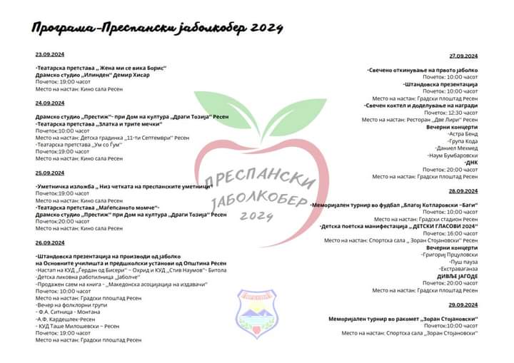 Од 26 до 28 септември 2024 година ќе се одржи познатата манифестација “Преспански јаболкобер” со која свечено се отпочнува берењето јаболка во Ресен и Преспа.